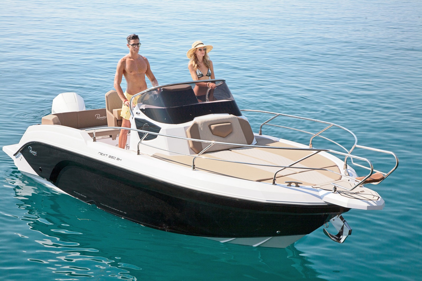Le RANIERI NEXT 220 SH à une cabine 3 couchages, longueur de 7m35 et largeur de 2m50, vous pouvez embarquer jusqu’à 7 personnes,.